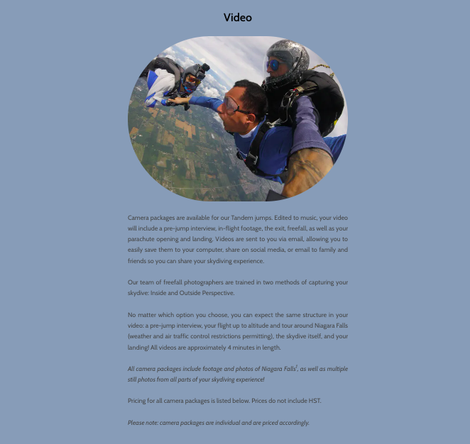 Niagara Skydive Centre Inc.Edited existing copy and wrote new copy for Niagara Skydive Centre Inc.’s website.